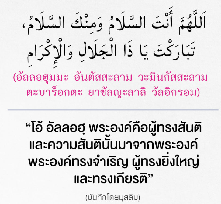 กล่าวสรรเสริญความสันติ: "อัลลอฮุมมะ อันตัสสะลาม วะมินกัสสะลาม ตะบาร็อกตะ ยาซัลญะลาลิ วัลอิกรอม" (โอ้อัลลอฮฺ พระองค์คือความสันติ และความสันติมาจากพระองค์)