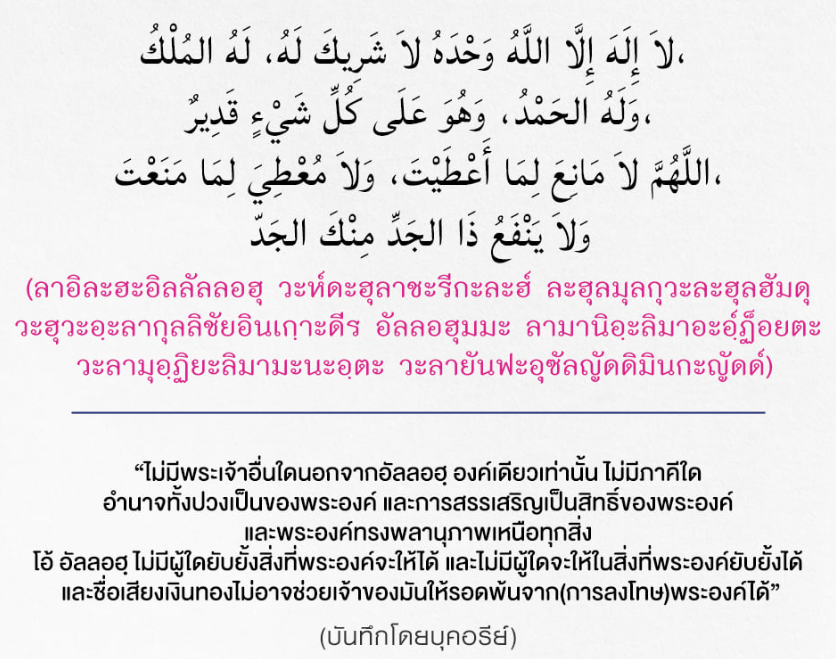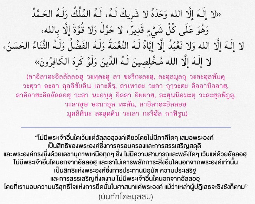 ปิดท้ายด้วยบทลาอิลาฮะฯ: เพื่อให้ครบ 100 ครั้ง ซึ่งมีผลบุญช่วยลบล้างบาปแม้จะมากเท่าฟองสบู่ในทะเล